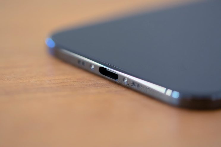 Der USB-C-Anschluss am unteren Rand ist fast so dick wie das Gehäuse selbst. Apple fertigt ihn aus 3D-gedrucktem Titan, das ist nötig, um ihn gleichzeitig stabiler als auch dünner zu machen.